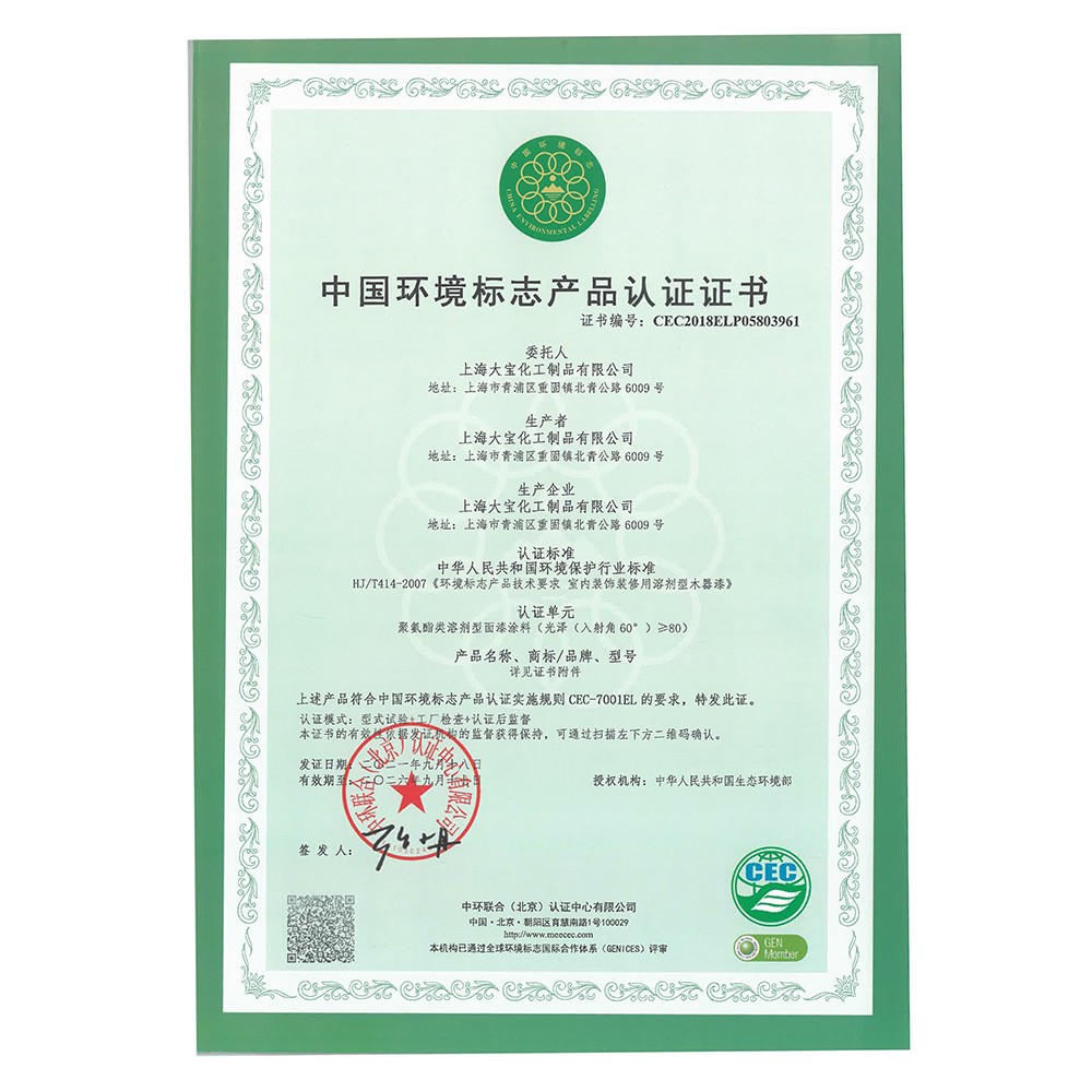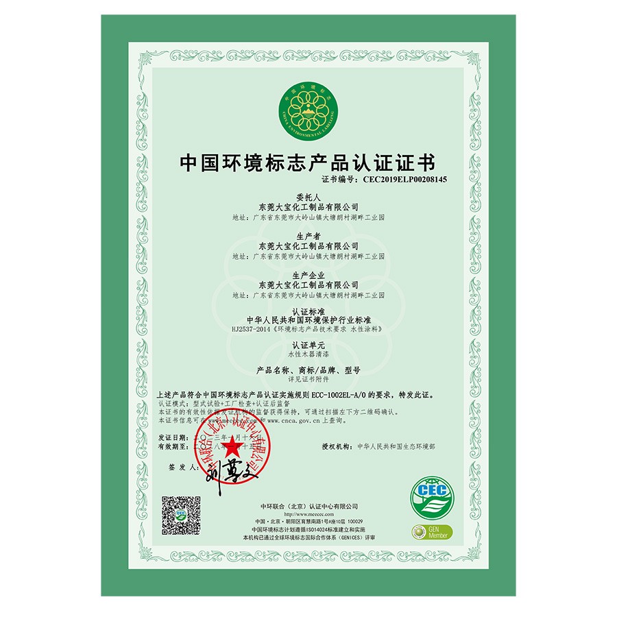 中國環(huán)境標志產(chǎn)品認證證書(水性木器漆)