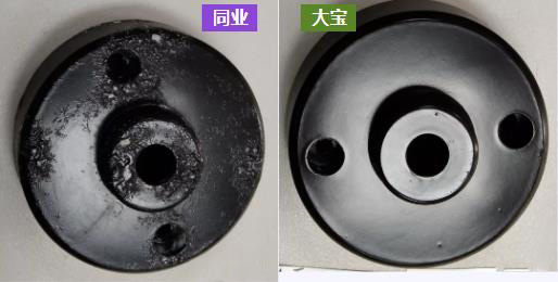 大寶漆與同業水性黑色啞光金屬烤漆在鋅合金素材上耐鹽霧500小時對比測試結果: