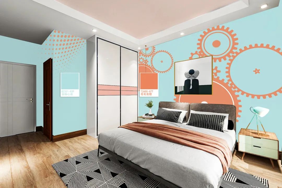 對比色彩搭配法,由于視覺感受較強烈,呈現出不同于單色墻面的大自然氛圍,視覺反差帶出獨特新意,整合成有趣活潑的視覺重點,但太密集使用對比色搭配,會使人眼花撩亂,盡量選定一組對比色即可,除了兩大對比色之外,細節建議搭配黑白灰的單品作為平衡。