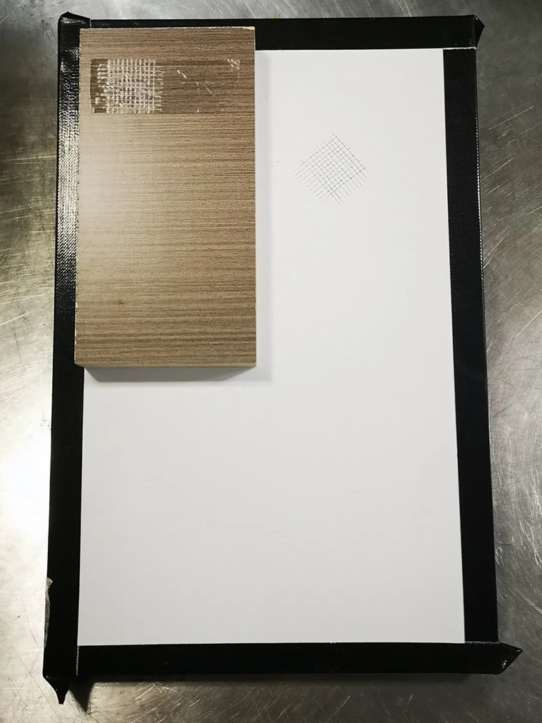 樣板10cm *15cm噴涂兩道110g/㎡,漆膜完全干燥后堆迭,放一個(gè)重壓槌(≒706g)在50℃下烘烤4hrs,取出冷卻分離,不可傷及漆膜。測試結(jié)果