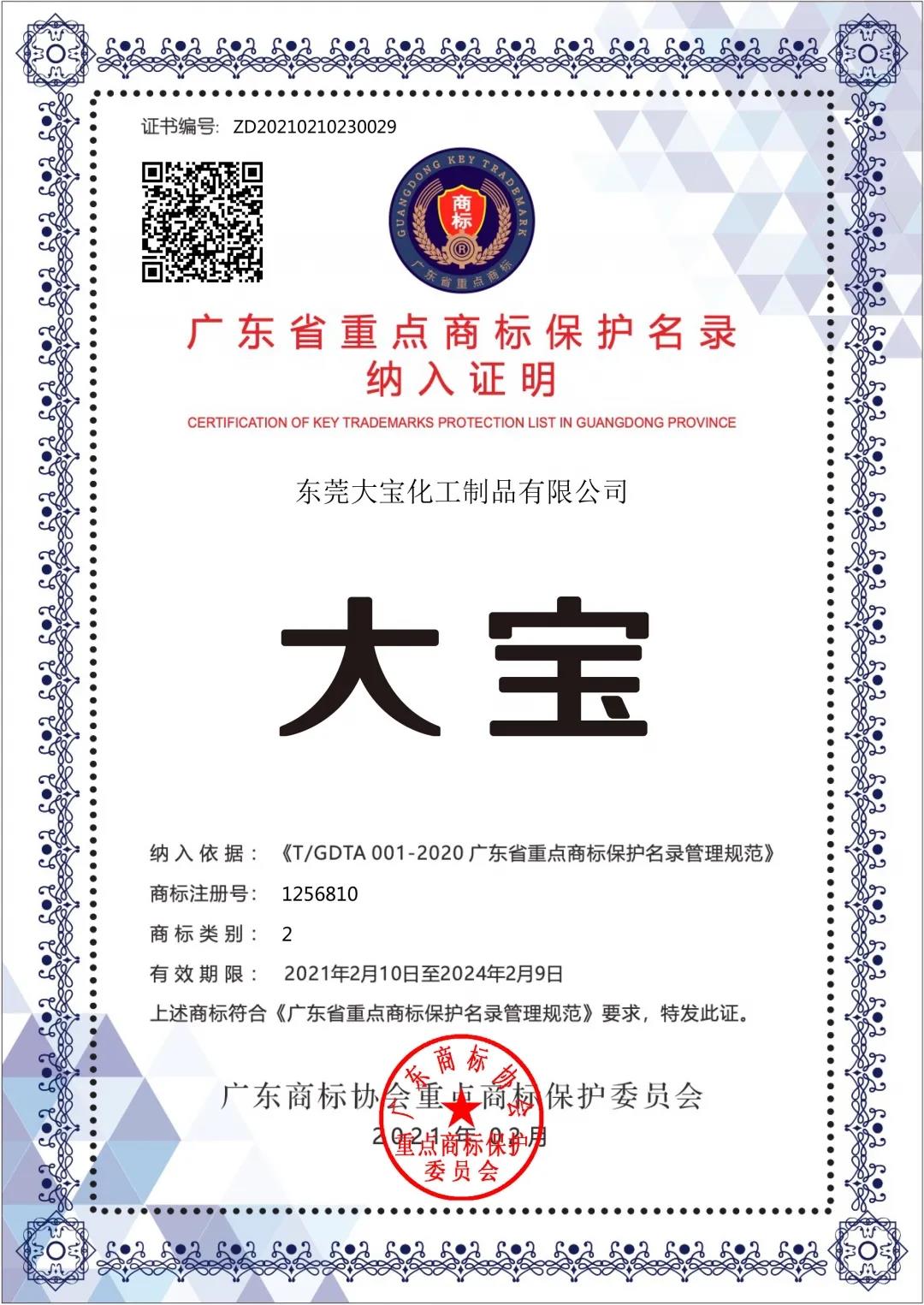 經(jīng)過近一年的嚴(yán)格審查和篩選,近日,大寶漆商標(biāo)被納入廣東省重點(diǎn)商標(biāo)保護(hù)名錄。據(jù)悉本次評(píng)選涵蓋全國各大知名品牌企業(yè),最終有790多件商標(biāo)納入本次保護(hù)名錄中!新征程喜訊加磅,企業(yè)實(shí)力及品牌價(jià)值再獲權(quán)威認(rèn)證!