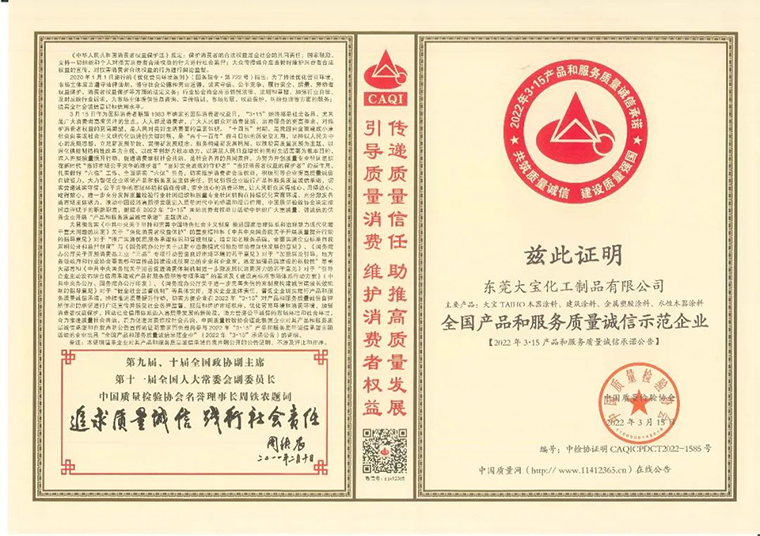 近日,大寶漆憑借過硬的產品質量、創新的服務理念量和強大的品牌影響力,再次榮獲由中國質量檢驗協會頒發的“全國產品和服務質量誠信領先品牌”、“全國產品和服務質量誠信示范企業”、“全國消費者質量信譽保障產品”、“全國質量檢驗穩定合格產品”四項權威認證證書。