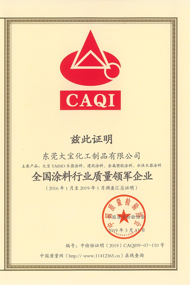 中國質(zhì)檢協(xié)會通過頒發(fā)“全國涂料行業(yè)質(zhì)量領(lǐng)軍企業(yè)”和“全國質(zhì)量檢驗穩(wěn)定合格產(chǎn)品”證書,旨在表彰安全生產(chǎn)、質(zhì)量管理體系健全、售后服務(wù)制度完善、有社會責(zé)任感、講誠信重質(zhì)量并在行業(yè)具有廣泛代表性的優(yōu)秀企業(yè)。作為國家高新技術(shù)企業(yè),大寶漆不論是在產(chǎn)品質(zhì)量上,還是在品牌服務(wù)、涂裝體驗都走在了行業(yè)的前列。