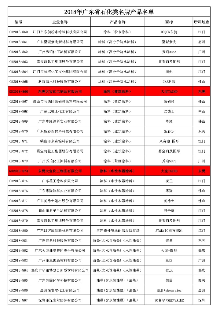 根據《廣東省名牌產品評價指南》標準要求,在企業自愿申報的基礎上,經申報資料初審、申報數據公示、企業現場審查、專家綜合評價、廣東質量品牌評審專家委員會審議確認,授予大寶化工生產的“大寶漆”牌涂料(詳見附件)為2018年度廣東省“石化類名牌產品”。