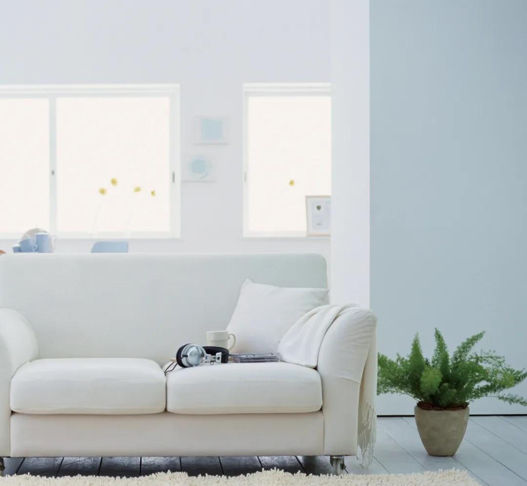 配色整體以淡藍色為主,形成樸素、靜謐的氛圍。用白色的沙發、書架加以中和,很好地創造出寧靜的空間質感。