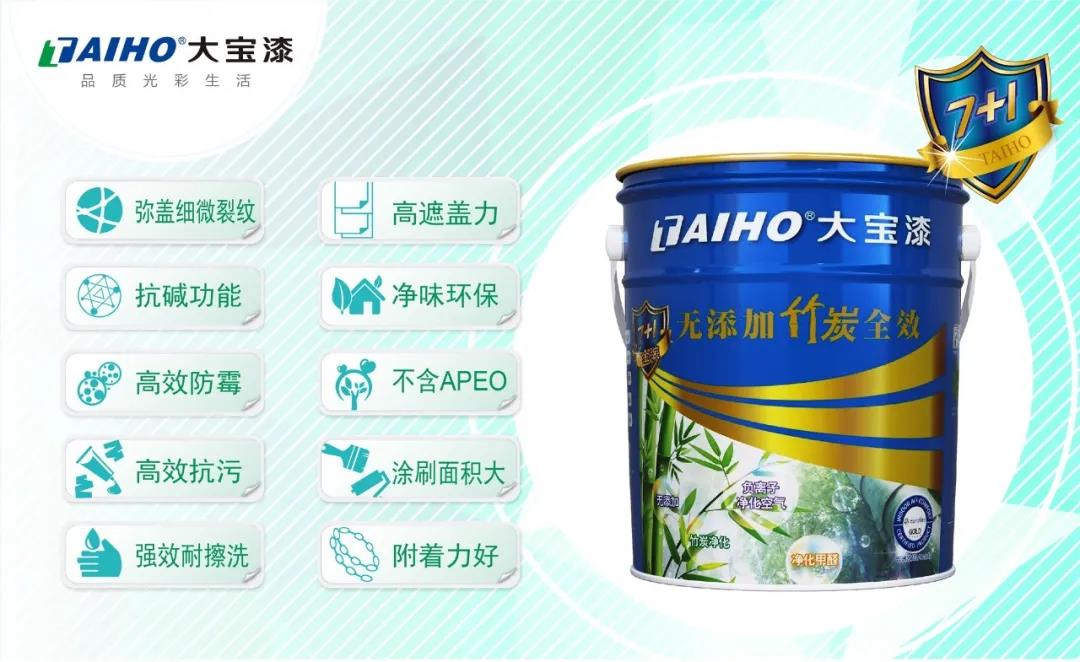 感受凈味空間,體驗綠色家居。大寶金裝7+1無添加竹炭全效墻面漆,產品甄選優質原材料,配合負離子凈化科技,天然竹炭因子,凈化室內空氣,并能有效去除多種細菌,在配方及生產過程中無人為添加苯等有害物質。